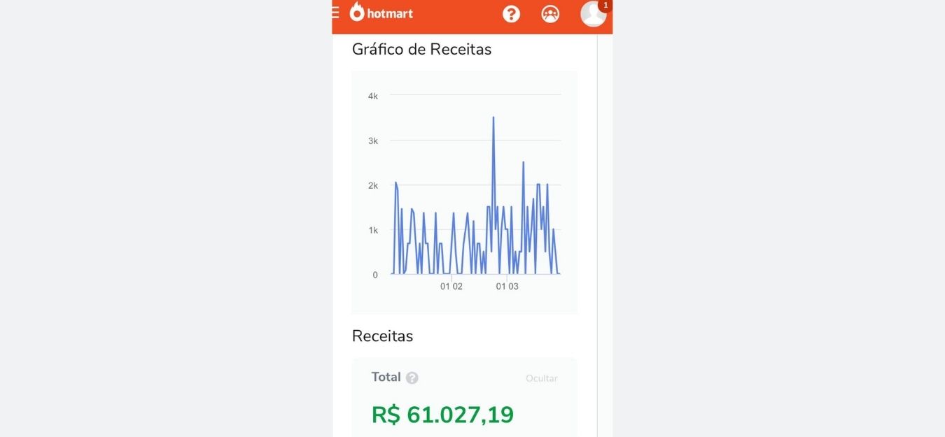 Aqui embaixo está o print do extrato de faturamento dele, pela plataforma Hotmart, que ele utiliza para as vendas do seu infoproduto: